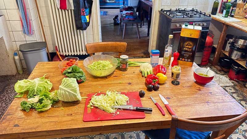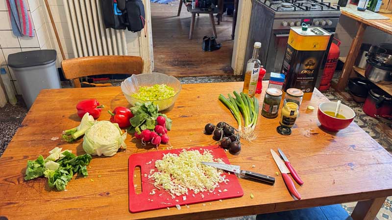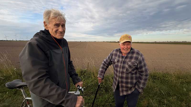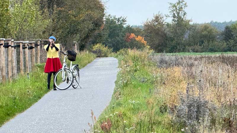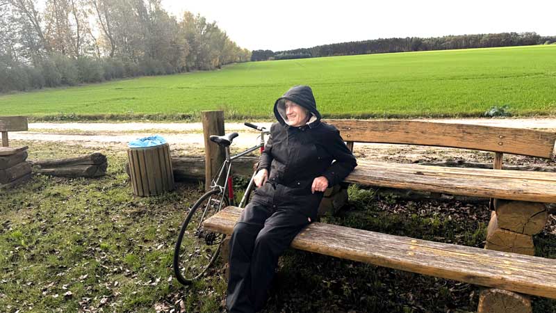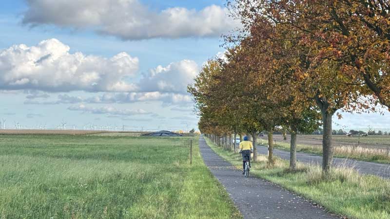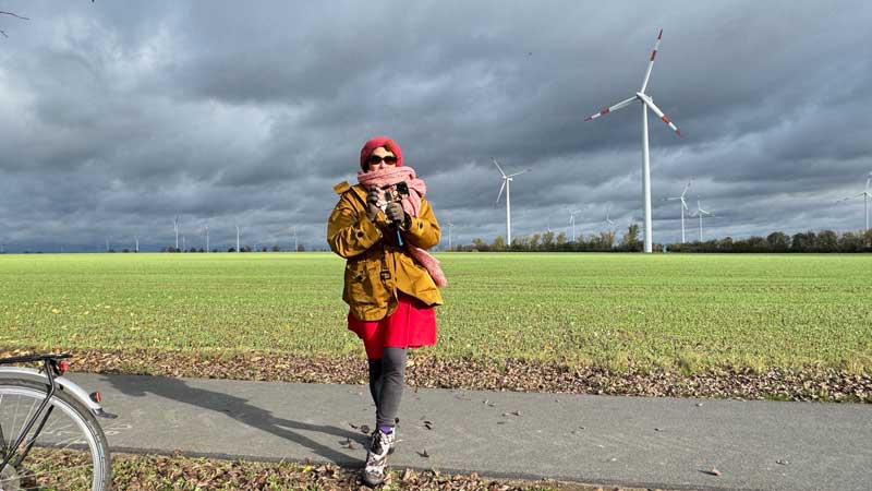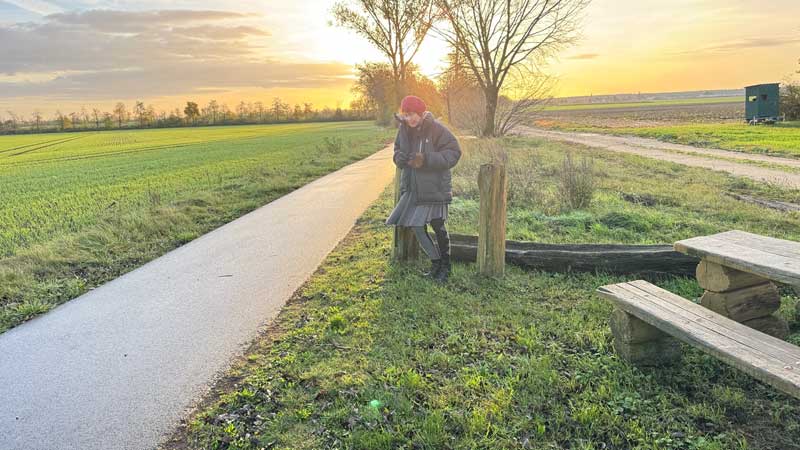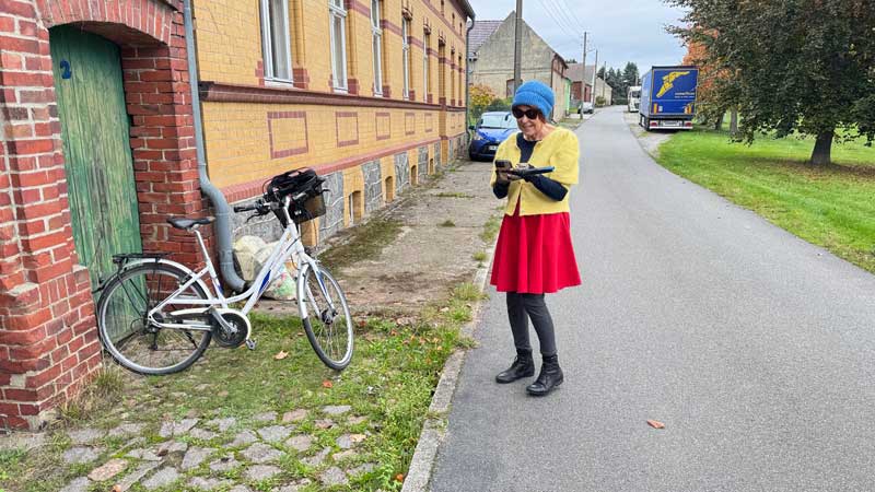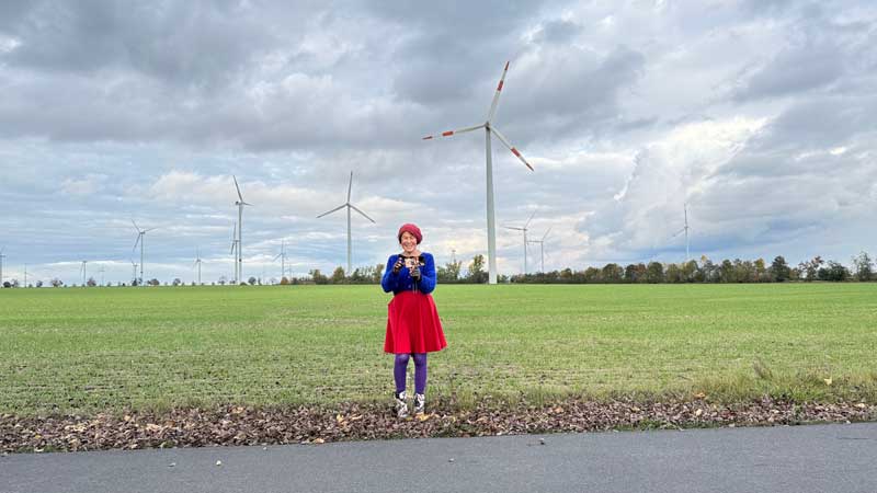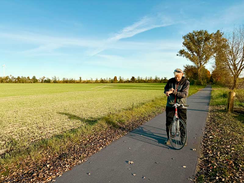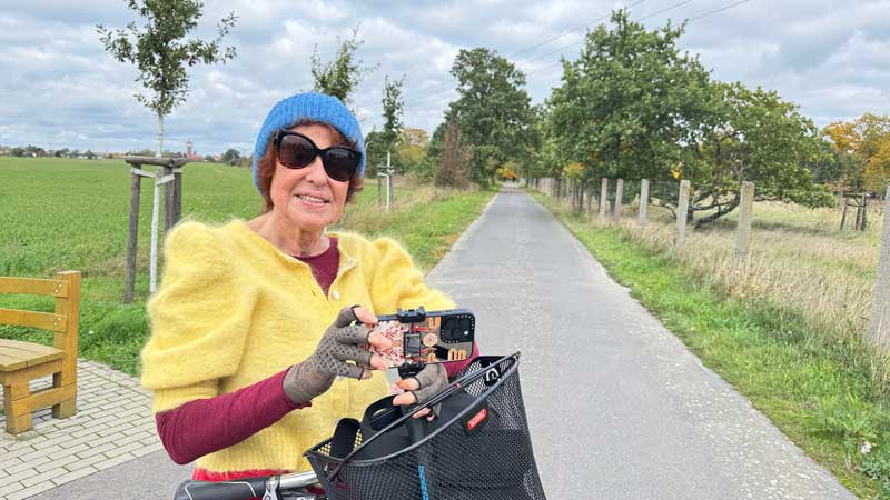 | 17.10..25 | ![]() 6.33 Uhr ![]() Nach dem Frühstück kaufen Micaëla und ich zusammen ein. Micaëla findet ihre rote Mütze und ihre Sonnenbrille, die sie schon seit mehreren Tagen gesucht hat. Ich mache einen frischen Salat. ![]() Nach dem Mittagessen fahren Micaëla und ich zusammen Fahrrad. Nach sechswöchiger Pause zum ersten Mal zu den Windrädern ![]() …wir dokumentieren das durch ein Selfie. Wir finden diesen Tatort, den wir am Vortag abgebrochen haben, wieder und sehen ihn zuende. Karsten Schwanke wiederholt, was er am Vortag gesagt hat. Erst am Samstag und Sonntag wird es wieder schön. | |
