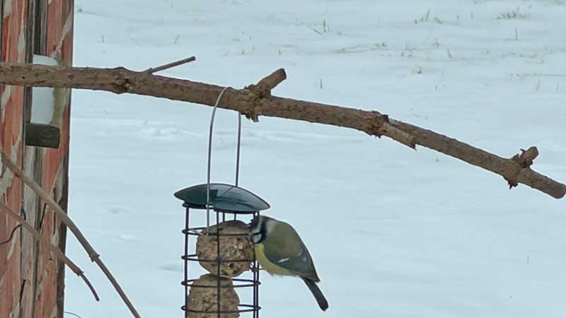 Ich fahre zu REWE, um die Zutaten für eine Rotwein-Schalottensoße einzukaufen. Als ich aus dem Haus gehe, sehe ich, wie die Meisen meine Futterkonstruktion benutzen.