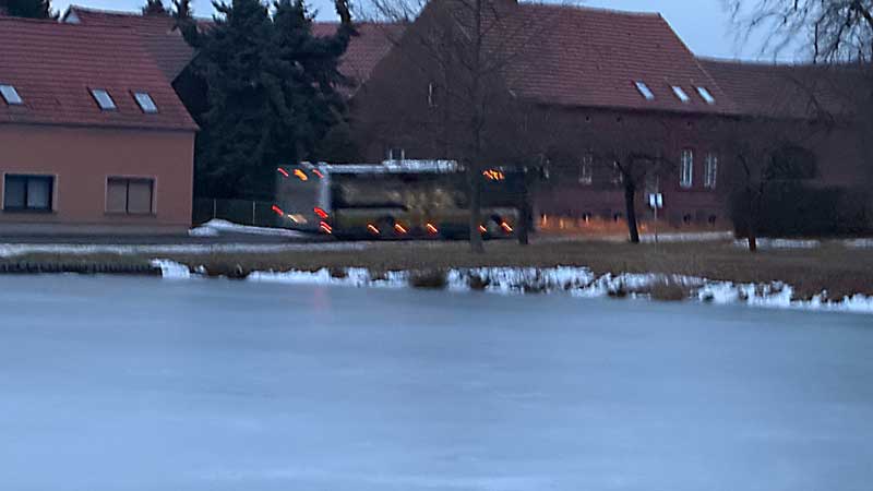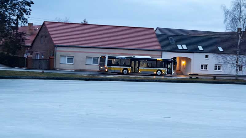 …7.10 Uhr. Auf der anderen Seite des Dorfteichs kommt der Schulbus.