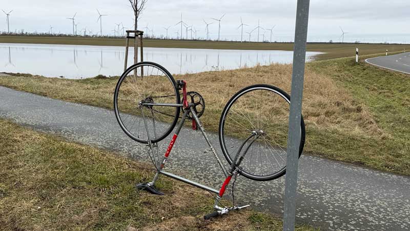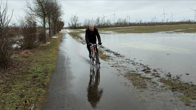 …zu den Windrädern kommen wir nicht, weil ein Schmelzwassersee den Radweg überflutet hat.