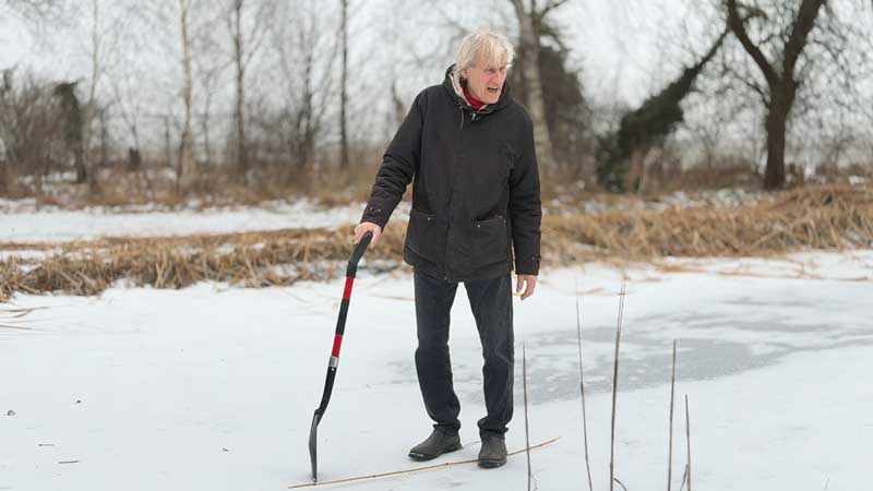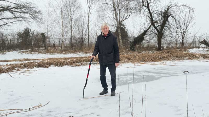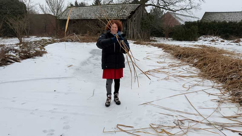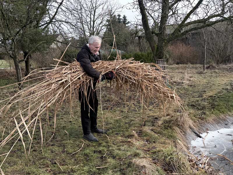 Danach werfen wir alle abgeschnittenen Schilfhalme, die auf dem Teich herumliegen an Land, denn es beginnt bereits zu tauen.