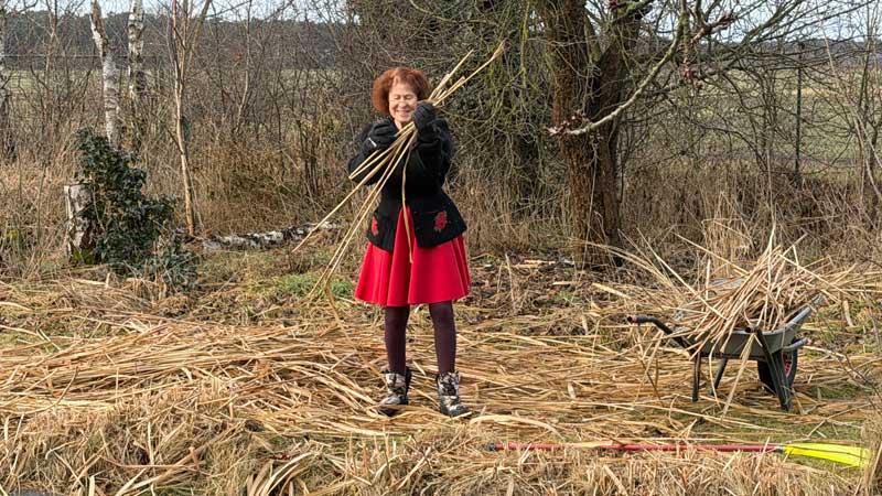 Nach dem Frühstück um 10.30 Uhr fangen Micaëla und ich damit an, das geschnittene Schilf in die Scheune zu transportieren…