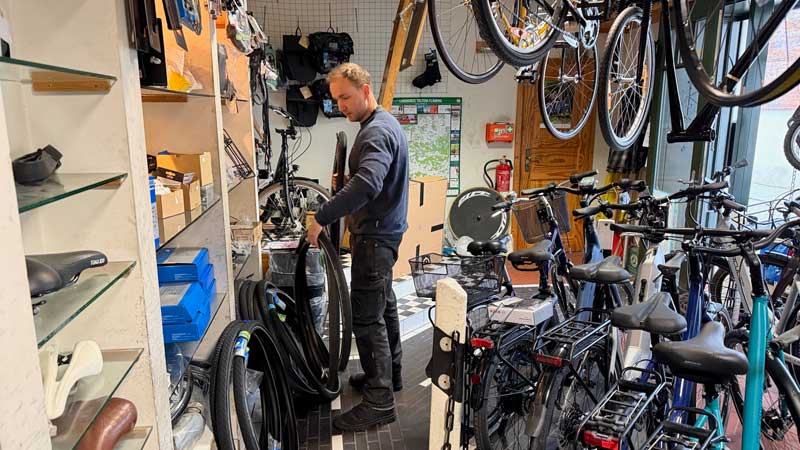 Um 10 Uhr bin ich bei meinem Fahrradhändler in Jüterbog. Der Monteur sagt, der Mantel meines Hinterreifens ist völlig abgefahren. Kein Wunder, dass der Schlauch beim klrinsten Steincen platzt.