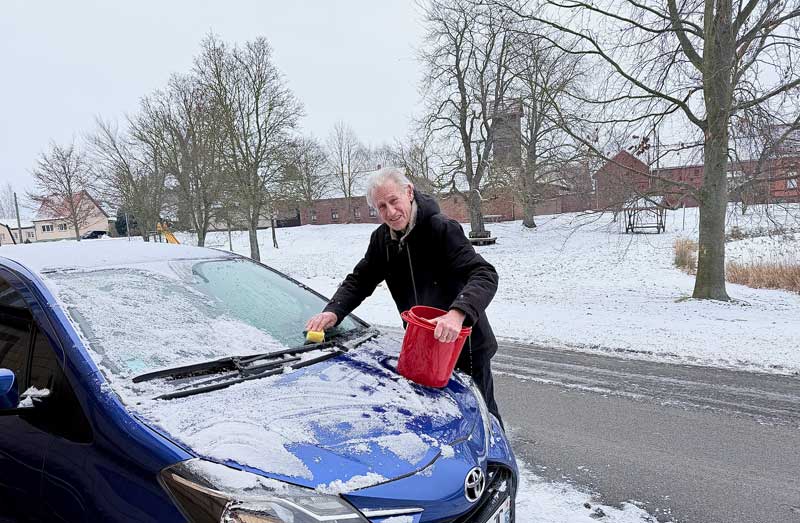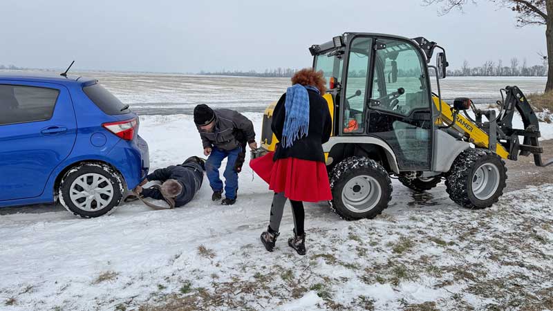 Diesen freundlichen Herrn hat Micaëla in Ihlow gefunden. Wir versuchen es zunächst zu Dritt. Doch dann ruft der Mann seinen Freund mit einem Radlader. Es ist inzwischen 13.28 Uhr…