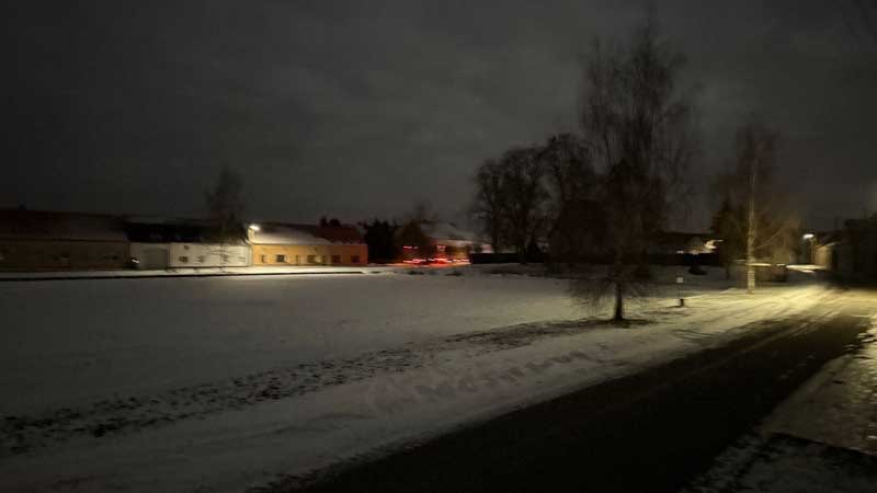 Als es aufgehört hat zu schneien, fahre ich um 11 Uhr mit den Fahrrad durch den frisch gefallenen Schnee zum Kartoffellager…
