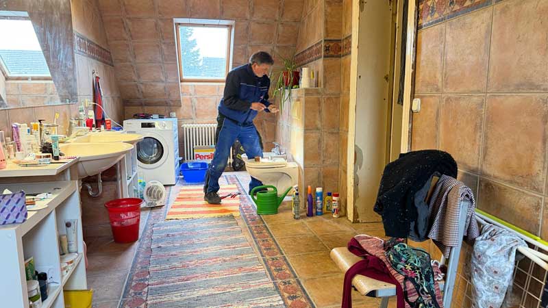 Um 14.10 kommt ein Monteur der Firma HATEC, denn unsere Toilettenspülung im Badezimmer funktioniert nicht. Er stellz fest, dass das Leitungsrohr eingefroren ist.