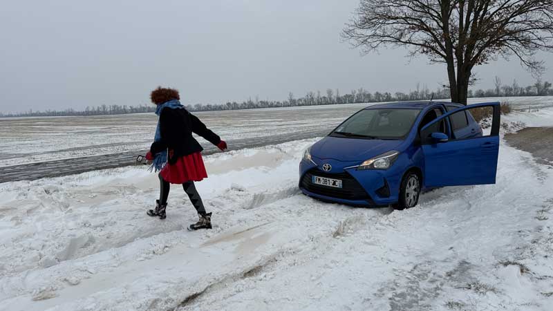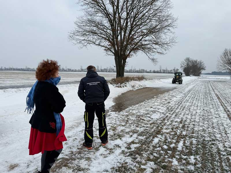Wir kommen auf dem vereisten Feldweg bis zu dieser Schneeverwehung. Etwa zehn Meter konnte ich den Wagen mit Hin-und Herschaukeln zurückschieben. Dann war Schluss. Micaëla holt Hilfe. Ich friere und denke an die mögliche Öllieferung.