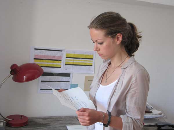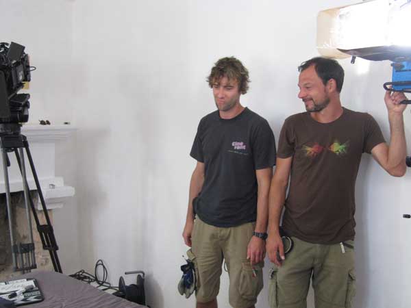 | 2.10.11 | Der 18. Drehtag. Wir drehen heute sieben Szenen. Eigentlich meine Glückszahl, aber die Sicherung in Abrahams Haus fliegt beim Drehen der zweiten Szene raus und keiner weiß, wo der Sicherungskasten ist. Der Hausbesitzer in Wien muss es uns am Telefon erklären. Das bringt uns etwas aus dem Tritt. Außerdem weht ausgerechnet heute ein starker Wind, dessen Böen Tonprobleme machen. An das Meeresrauschen haben wir uns ja inzwischen gewöhnt.![]() Lucas sagt Nike, dass Abraham vor zehn Minuten abgefahren ist und das Haus abgeschlossen hat. Aber Nike hat einen Zweitschlüssel zum Haus. ![]() Nike geht mit Lucas und Wilhelm ins Schlafzimmer, wo sie am Tag vorher die Bettszene zwischen Abraham und Laura gedreht hat. ![]() In Abrahams Arbeitszimmer findet Nike seinen Abschiedsbrief und eine Bankvollmacht. Während sie den Brief liest, schiebt sich eine Wolke vor die Sonne und verdüstert die Szene. Genau zur rechten Zeit. Ich drehe tatsächlich im Einklang mit den Göttern. ![]() Nike erzählt Lucas und Wilhelm von dem Abschiedsbrief. ![]() Im Maskenzimmer ist Simone mit dem Bart für den stummen Fischer fertig geworden. Wilhelm sagt ihr, dass Lucas aus Berlin zurück ist. ![]() Lucas gesteht Nike, dass er wieder angefangen hat, Alkohol zu trinken. ![]() Nike und Wilhelm beraten, wie sie mit den Dreharbeiten weitermachen können. Wilhelm fragt Nike ganz direkt, ob sie mit Lucas geschlafen hat. |